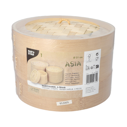 Der 3-teilige Dampfgarer „ASIA“ aus hochwertigem Bambus ist ideal für die schonende Zubereitung von Gemüse, Fisch, Dim Sum oder anderen asiatischen Spezialitäten. Mit einem Durchmesser von 21 cm und einer Höhe von 13,5 cm bietet er besonders viel Platz und eignet sich für größere Portionen oder mehrere Zutaten gleichzeitig, ohne dass sich die Aromen vermischen.