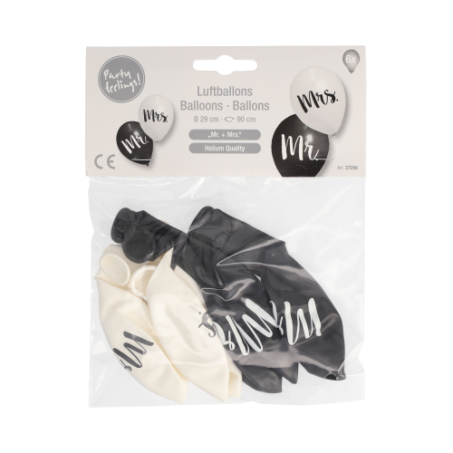 Diese hochwertigen Luftballons mit „Mr.“- und „Mrs.“-Druck in Schwarz und Weiß setzen elegante Akzente bei Hochzeiten, Verlobungen oder Jahrestagen. Mit einem Durchmesser von 29 cm und einem Umfang von 90 cm sind sie ideal für Dekorationen oder als Fotohintergrund. Die Ballons lassen sich sowohl mit Helium als auch mit Luft befüllen und schweben bei Heliumfüllung eindrucksvoll im Raum.