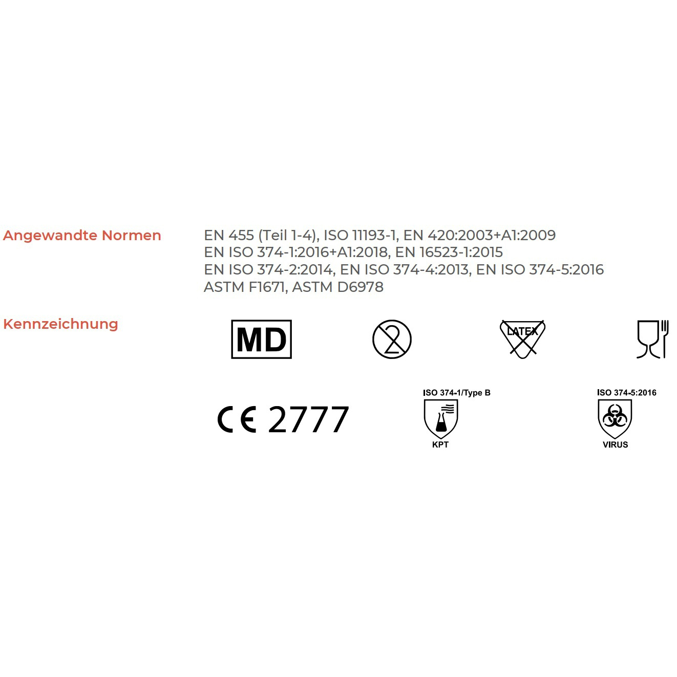 - Bemerkungen: Universalhandschuhe, sehr gute chemische Beständigkeit, angenehmer Tragekomfort, unsteril