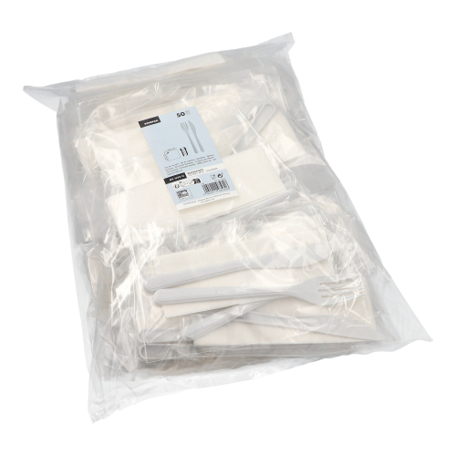 Mehrweg-Bestecksets PP-MF 22 cm weiss : Messer, Gabel, Serviette in Folienbeutel