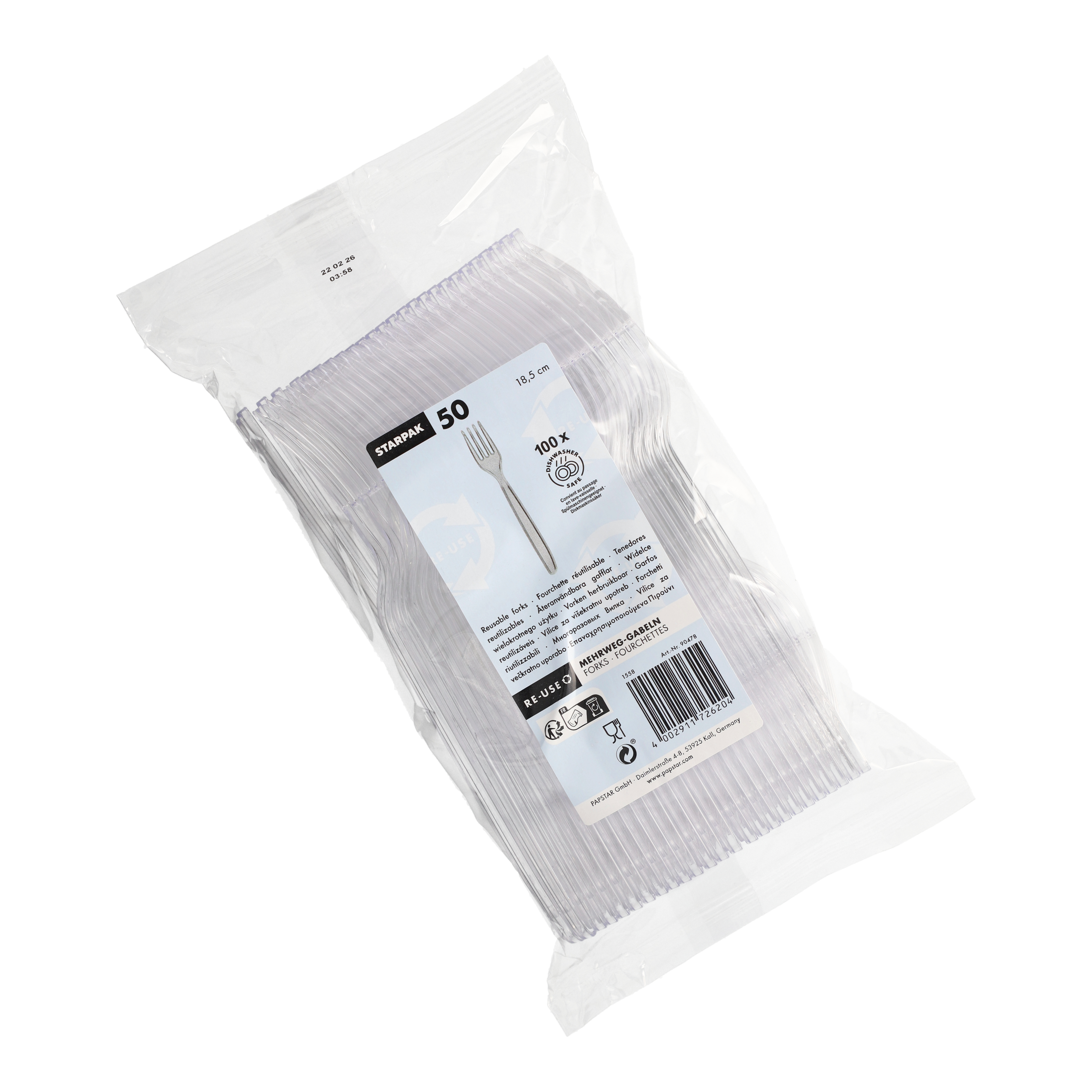 Diese stabilen Mehrweg-Gabeln aus transparentem Polystyrol sind ideal für den privaten Haushalt – ob für Gartenpartys, Picknicks, Kindergeburtstage oder den täglichen Einsatz. Mit 18,5 cm Länge liegen sie gut in der Hand und bieten eine zuverlässige Alternative zu Einwegbesteck. Das spülmaschinengeeignete Material lässt sich einfach reinigen und mehrfach verwenden. Gleichzeitig überzeugt die Gabel durch ihre schlichte, moderne Optik und ihre Alltagstauglichkeit.